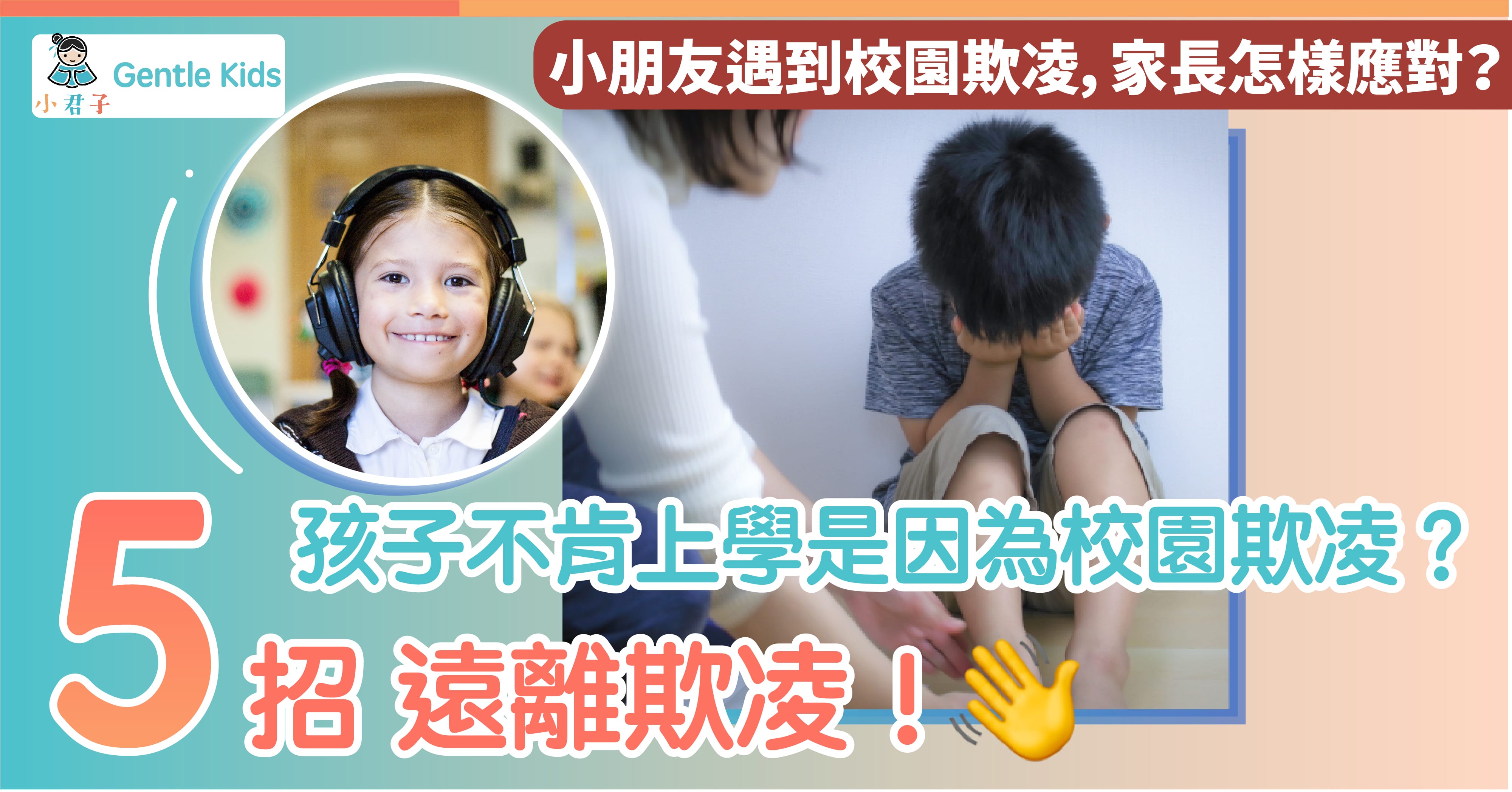 獅子山青年商會及香港家庭調解協會一項調查發現,600多名受訪的小學生中,37.8%曾於過去一年遭遇同輩欺凌,14.3%試過被拳打腳踢、19.8%曾遭杯葛排擠。然而,19%學童遇欺凌時會不知所措,亦有10.4%及4.8%受訪者因而抗拒上學及萌生自殺念頭。由此可見,欺凌現象十分嚴重,而家長有必要教孩子如何去應對這種情況,保護自己。所以小君子為各位家長帶來一系列的對策,幫助孩子遠離欺凌。