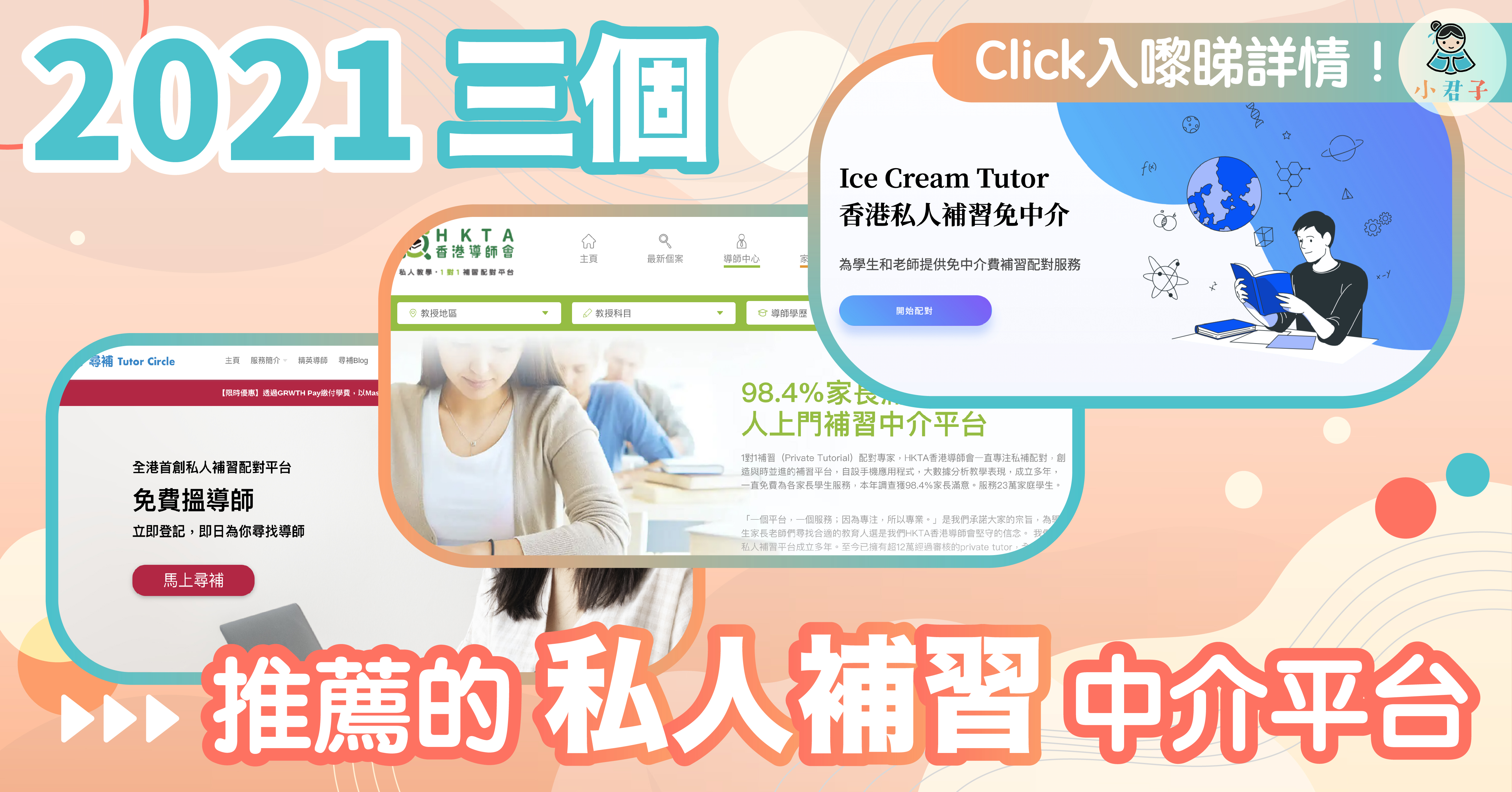 Ice Cream Tutor 是近年才興起的補習中介平台,其主打特色為免中介,即使導師家長學生配對完全自由及高透明度,並不會像普遍的中介平台,有可能會隱藏導師資料,家長學生可以根據導師的資歷、經驗、薪金要求去選擇最相宜的導師。此外,Ice Cream Tutor可以讓家長學生及導師透過平台進行直接交流,無須交換個人資料以作溝通,私隱度極高。