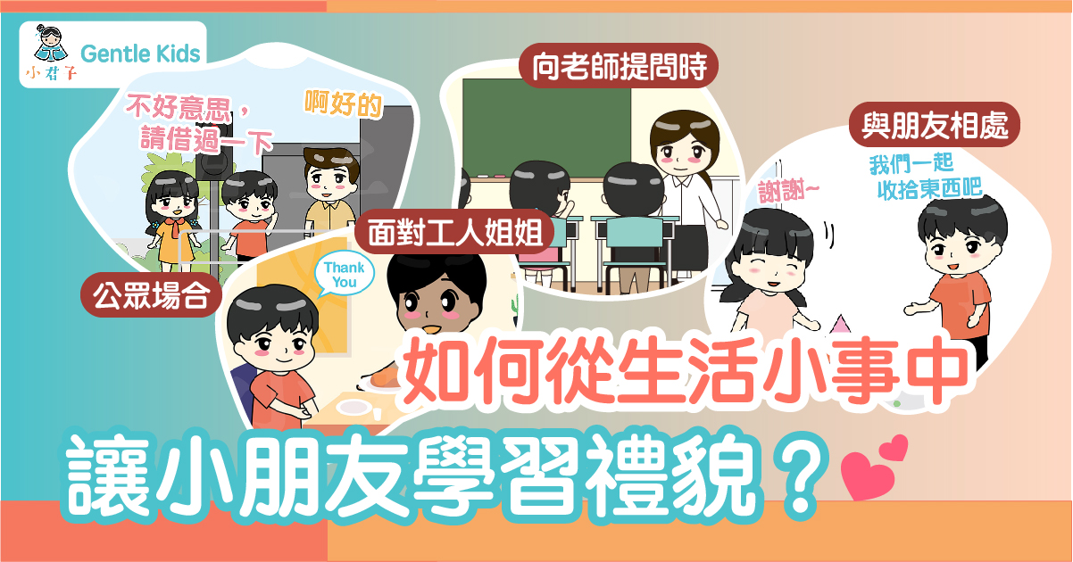 有時候,小朋友可能覺得只需要對著長輩有禮貌,與同輩相處的時候就忽視了。對著朋友時,同樣需要有禮,這樣別人才會覺得被尊重,願意和他一起玩耍。除了見到朋友可以說「Hello」、「Byebye」之外,若接受了朋友的幫助或收到了他們的禮物,也要提醒孩子記得說「謝謝」、「多謝」。